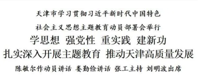 4月10日,天津市学习贯彻习近平新时代中国特色社会主义思想主题教育动员部署会举行。市委书记、市委学习贯彻习近平新时代中国特色社会主义思想主题教育领导小组组长陈敏尔作动员讲话。他强调,要深入学习贯彻习近平总书记在主题教育工作会议上的重要讲话精神和党中央决策部署,以高度的政治责任感和扎实的工作作风,高标准高质量开展好主题教育,学思想、强党性、重实践、建新功,为奋进新征程凝心聚力,为天津高质量发展注入强大动力。