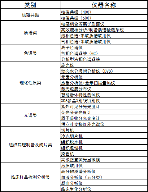研究院大型仪器设备能够提供核磁共振类、液相色谱/串联质谱联用仪等质谱类、气相色谱系统等色谱类、理化性质类、光谱类、临床样本分析类、组织病理制备及阅片类、临床样品检测分析类等仪器设备。