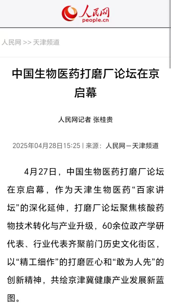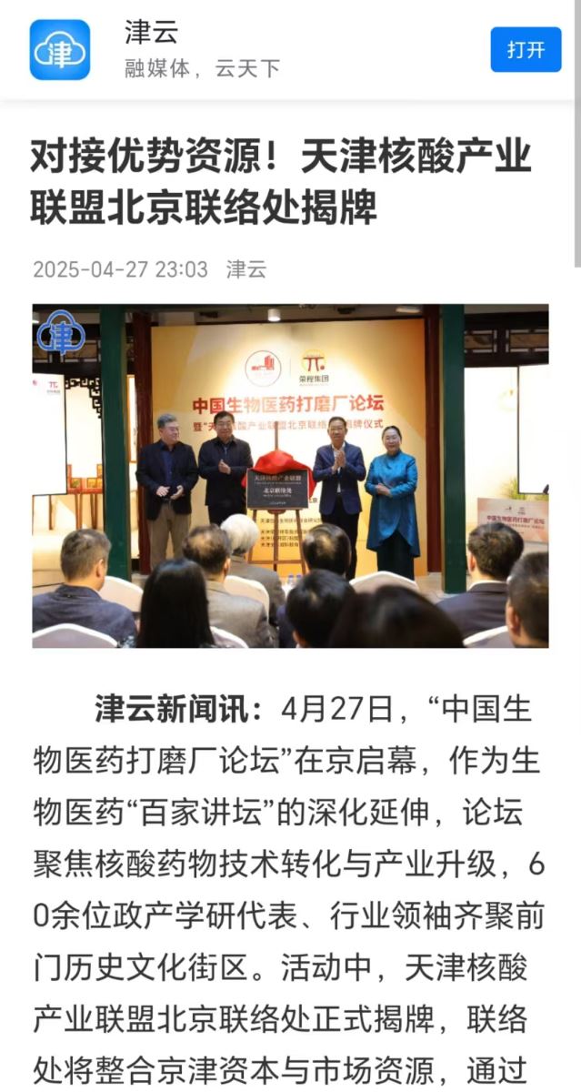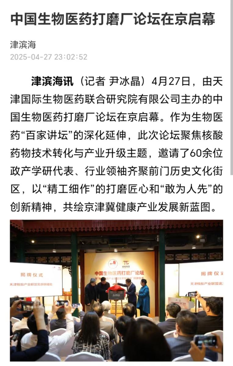 4月27日,由天津国际生物医药联合研究院有限公司主办的“中国生物医药打磨厂论坛”暨天津核酸产业联盟北京联络处揭牌在京圆满落幕,吸引人民网、天津电视台、津云、滨海融媒体等中央及地方媒体主流媒体深度报道。作为推动产学研深度融合、京津两地协同创新的生动实践,论坛通过主旨演讲、交流对话等形式,聚焦核酸药物技术转化与产业升级,呈现了研究院在推动关键技术攻关与产业转化方面的显著成效。