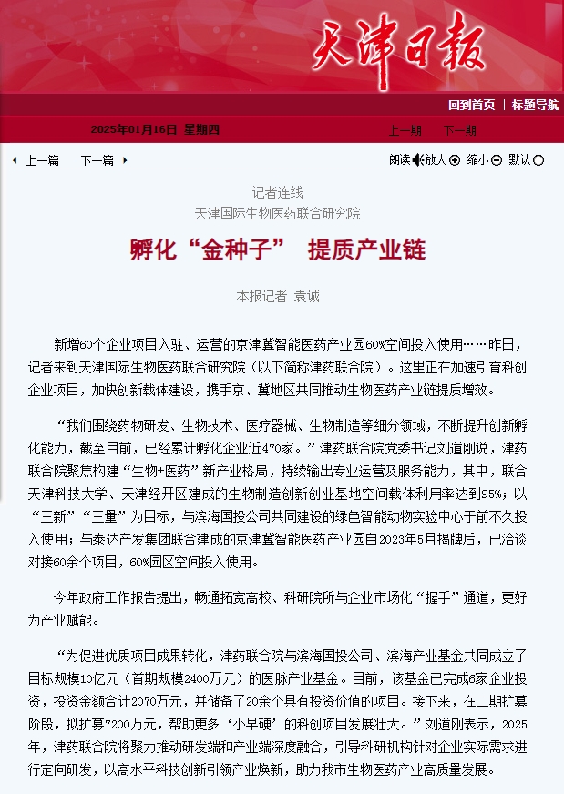 “为促进优质项目成果转化,津药联合院与滨海国投公司、滨海产业基金共同成立了目标规模10亿元(首期规模2400万元)的医脉产业基金。目前,该基金已完成6家企业投资,投资金额合计2070万元,并储备了20余个具有投资价值的项目。接下来,在二期扩募阶段,拟扩募7200万元,帮助更多‘小早硬’的科创项目发展壮大。”刘道刚表示,2025年,津药联合院将聚力推动研发端和产业端深度融合,引导科研机构针对企业实际需求进行定向研发,以高水平科技创新引领产业焕新,助力我市生物医药产业高质量发展。