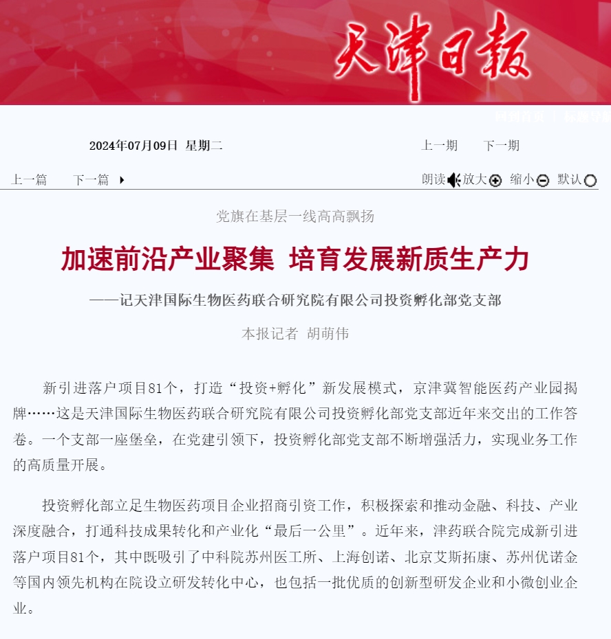新引进落户项目81个,打造“投资+孵化”新发展模式,京津冀智能医药产业园揭牌……这是天津国际生物医药联合研究院有限公司投资孵化部党支部近年来交出的工作答卷。一个支部一座堡垒,在党建引领下,投资孵化部党支部不断增强活力,实现业务工作的高质量开展。