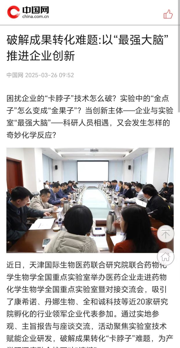 为帮助企业解决“卡脖子”技术,加速实验室“金点子”转化成“金果子”,前不久,天津国际生物医药联合研究院联合药物化学生物学全国重点实验室举办生物医药企业走进药物化学生物学全国重点实验室暨对接交流会。此次“走出去”活动是研究院组织发起的一次多维度赋能企业发展的生动实践,此次“走出去”实践获得《香港经济日报》、中宏网、中国网、天津电视台等各级媒体高频聚焦,累计被近10家媒体关注报道。