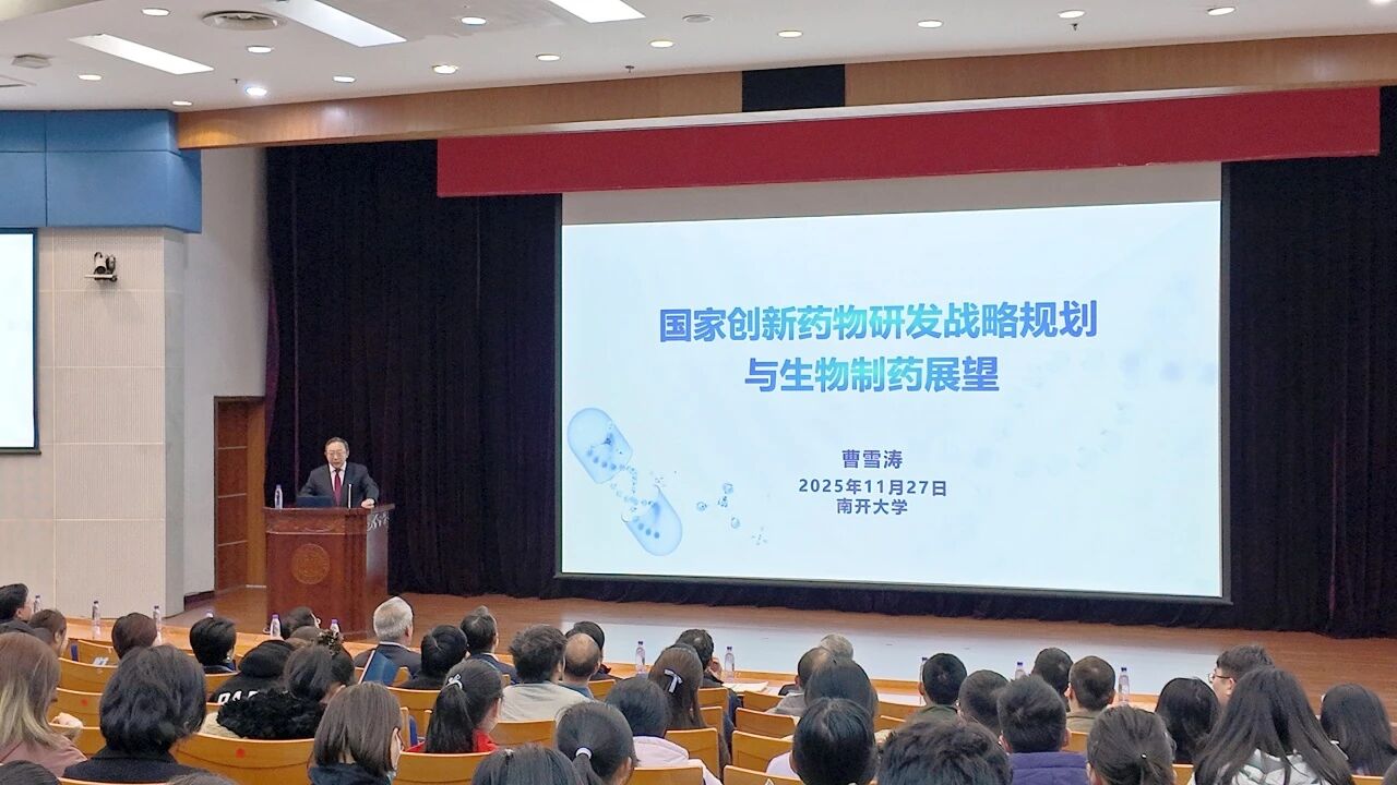11月27日,天津国际生物医药联合研究院原院长、曹雪涛院士在南开大学陈省身数学所二楼报告厅带来了一场主题为“国家创新药物研发战略规划与生物制药展望”的专题授课。津药联合院党委书记刘道刚、部分干部职工及孵化企业代表共同参与学习。