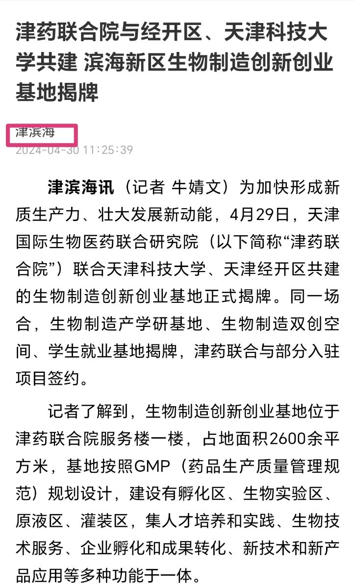 【津滨海】津药联合院与经开区、天津科技大学共建 滨海新区生物制造创新创业基地揭牌