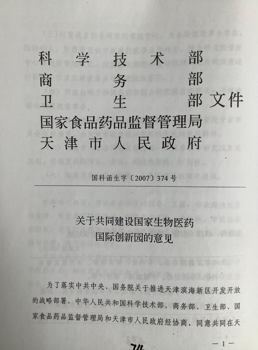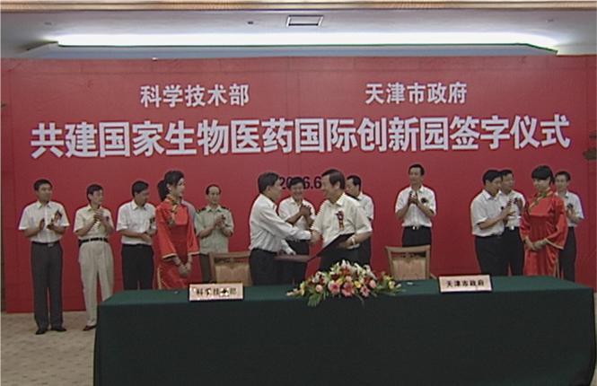 2006年6月,科技部与天津市政府在天津召开了第二次科技工作会商会议,双方共同签署了《科技部和天津市政府共同建设“国家生物医药国际创新园”议定书》,正式启动“生物医药国际创新园”和“天津国际生物医药联合研究院”的建设工作。2007年6月,国家科技部、国家商务部、国家卫生部、国家食品药品监督管理局签署协议,形成国家生物医药国际创新园的“四部一市”共建模式。